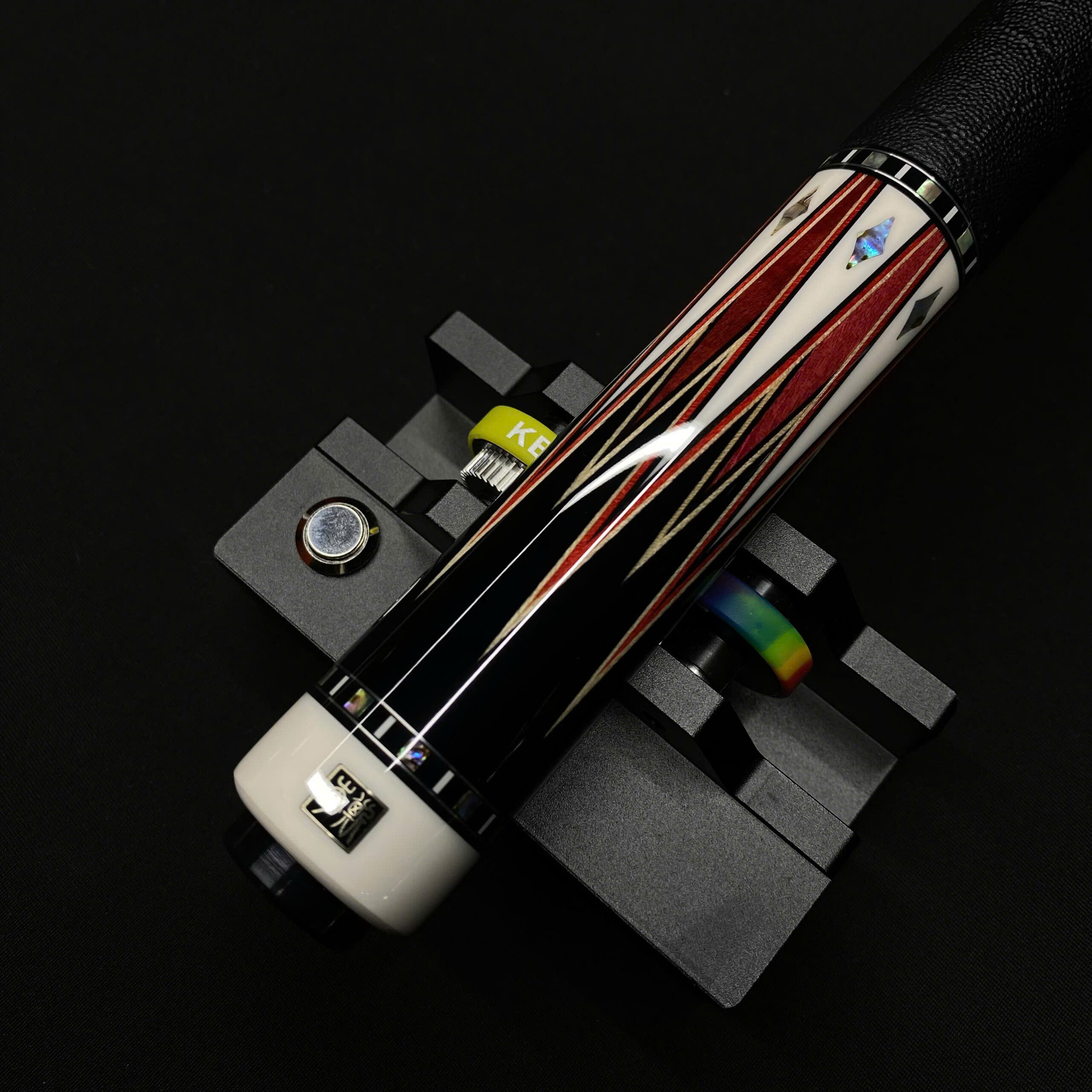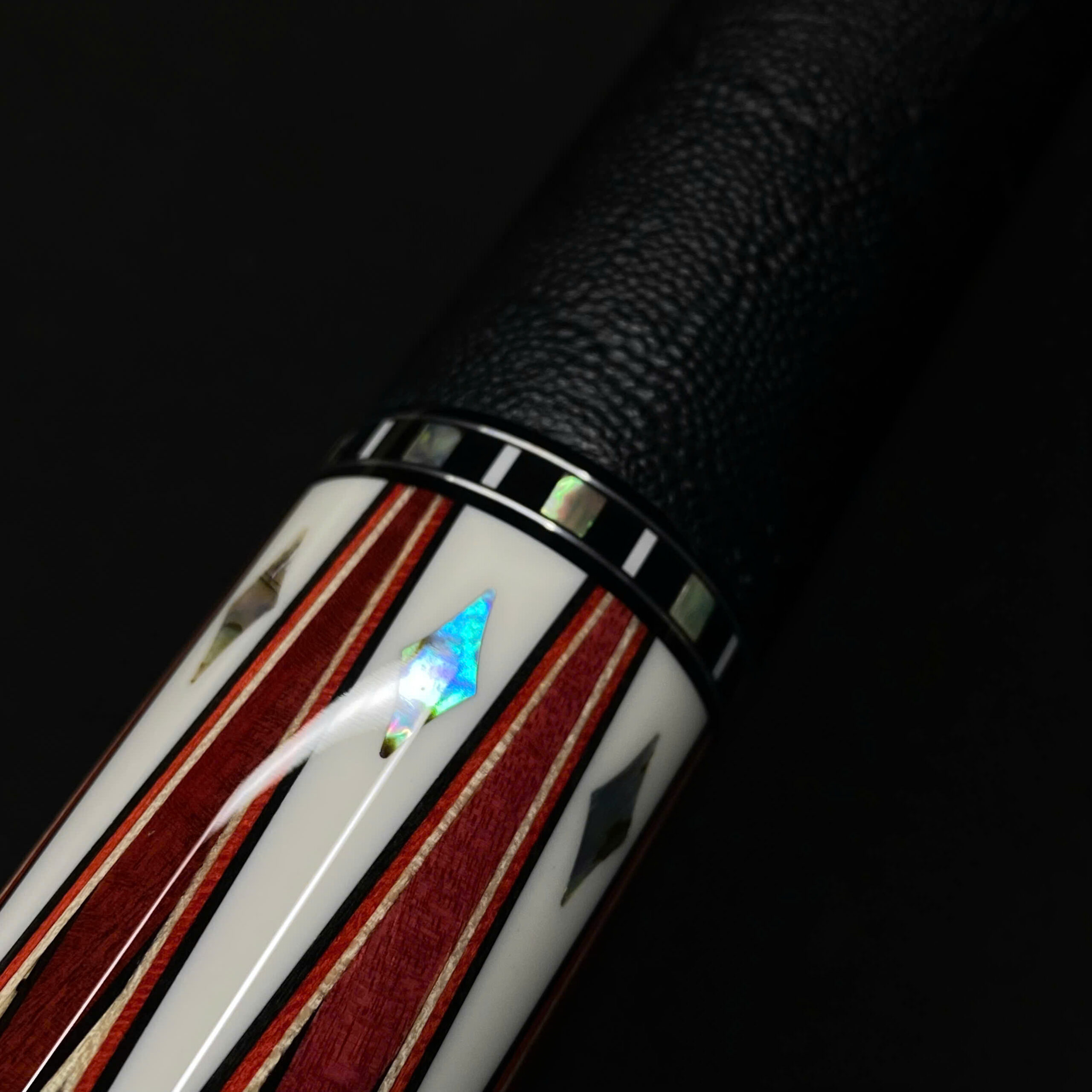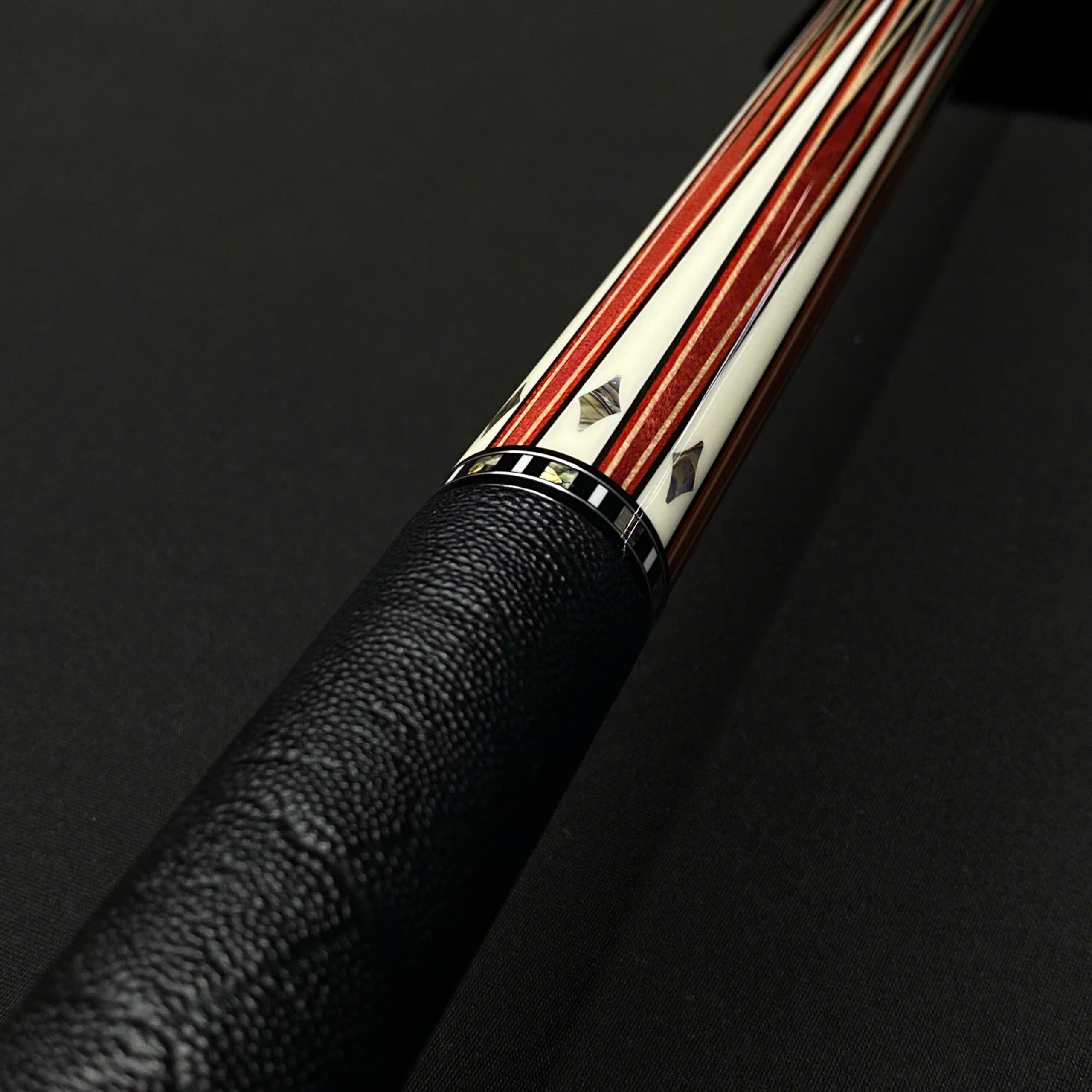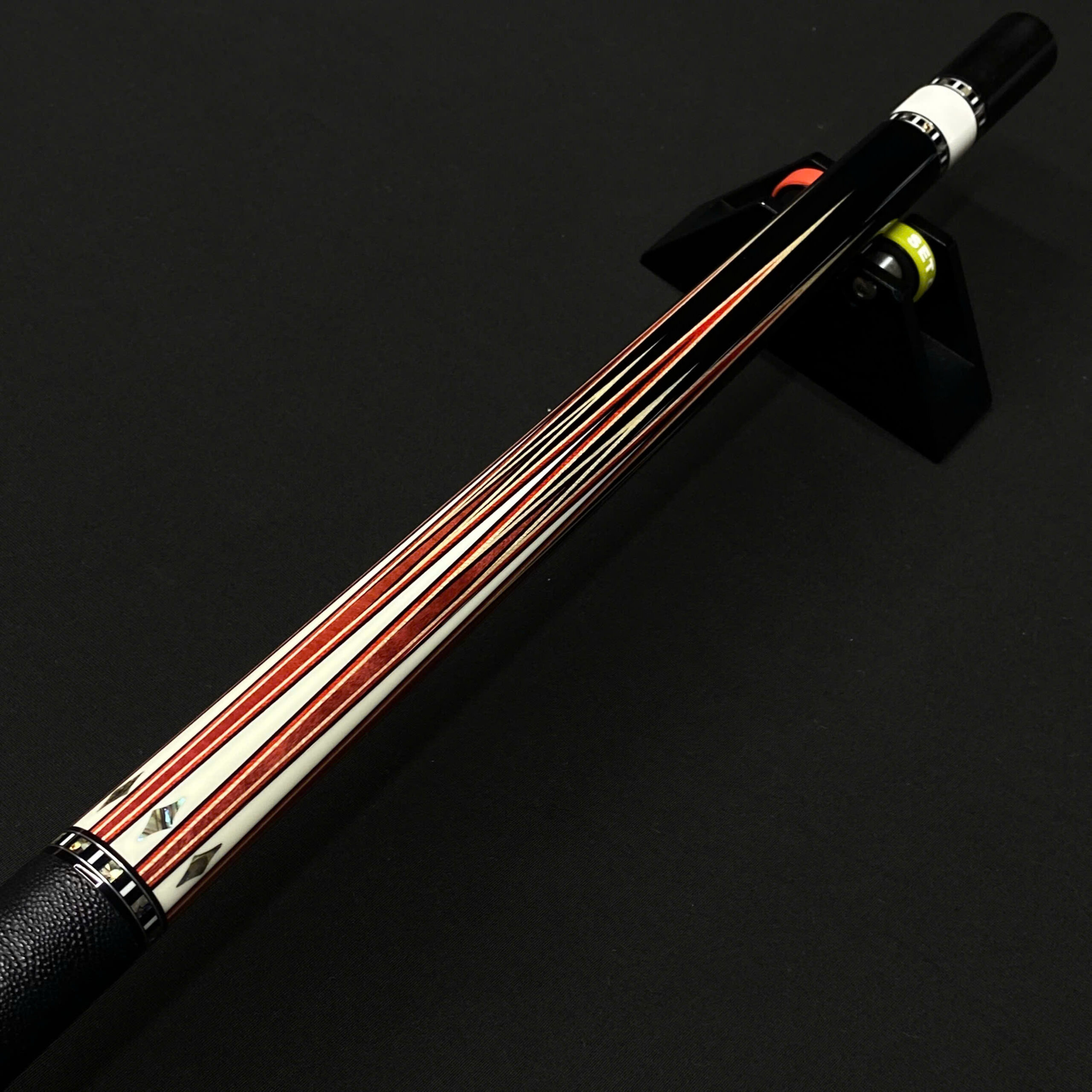 7 chỉa ngắn: Sử dụng Pink Ivory (Gỗ ngà hồng) – một trong những loại gỗ cứng và quý hiếm nhất thế giới với sắc hồng tự nhiên đặc trưng. Hệ thống mũi tên này được ngăn cách bởi các lớp chỉ gỗ (veneer) ba màu Đen/Đỏ/Maple, kết hợp cùng các họa tiết kim cương khảm bào ngư (Abalone) tạo nên sự sang trọng, tinh tế nhưng vẫn giữ được độ tĩnh của một cây gậy thi đấu.